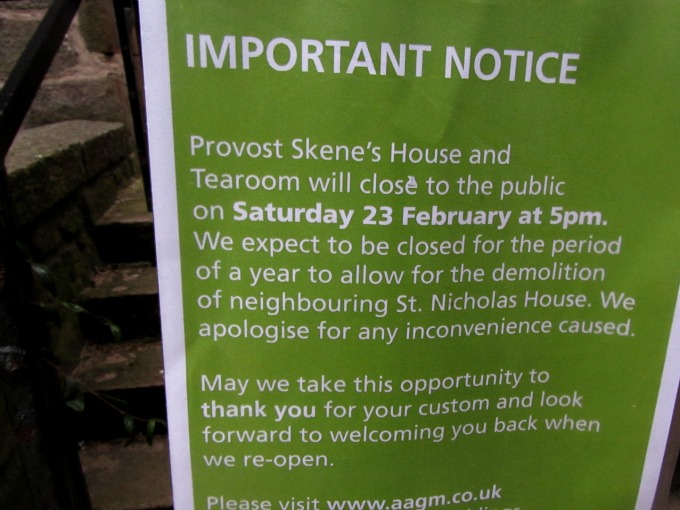 This is a story of when travel goes wrong. Sometimes you go somewhere, only to find that you can't do what you wanted to do. Such as the case in Skene's House. It's advertised all over the city as an exhibit of life in the 18th century, complete with a clothing display and a tea house. I was pretty excited about it. Then, I found this sign on the front door. It's closed for the next year.